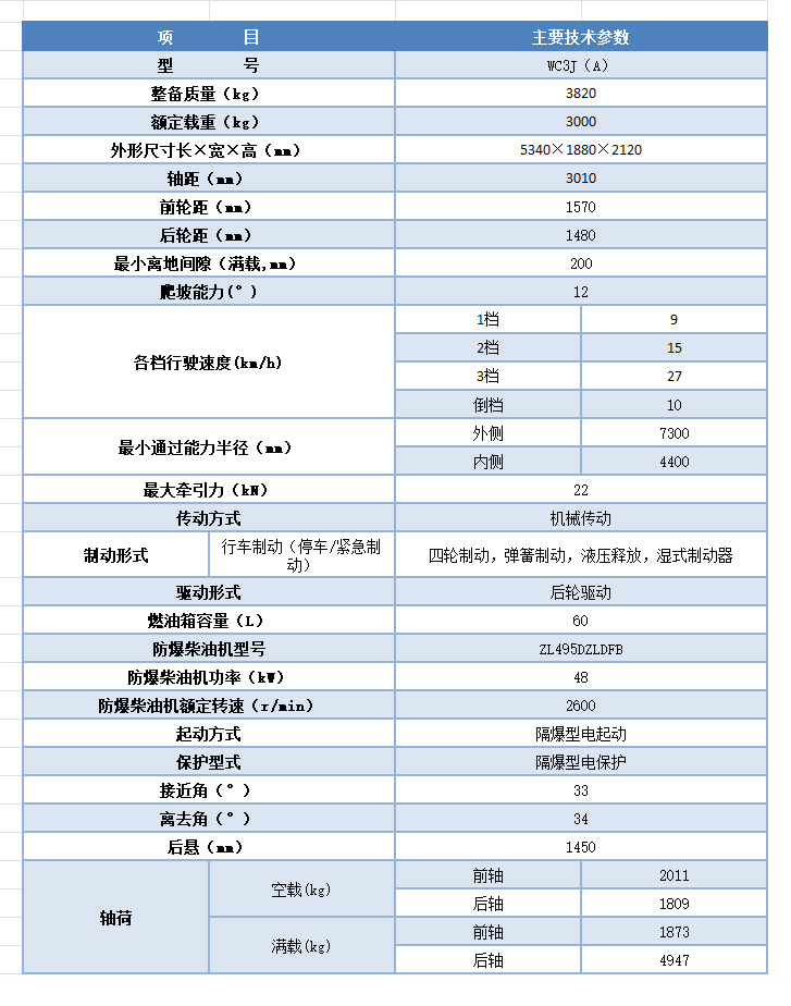 WC3J(A)型防爆柴油機無軌膠輪車是我公司根據中小型煤礦井下的運輸實際要求研制開發的一種新型運載工具,是一款以具有國Ⅲ排放標準、增壓中冷、電控高壓共軌噴射型式的ZL495DZLDFB防爆柴油機為動力、輸出功率48kW、機械傳動、濕式制動、后輪驅動的煤礦井下無軌式運輸機械。 失壓保護型濕式制動系統的應用,使工作更加可靠,因系統故障和制動管路發生任何故障而失壓時,制動器均能自動實現制動,確保車輛的安全,失壓保護型濕式制動器可以集行車制動、駐車制動和緊急制動于一身,精簡了結構,給車輛總體布局帶來方便。使車輛制動更加安全可靠。 該車動力強勁,性能穩定,加裝了先進的進排氣系統及自動保護裝置,具有可靠優越的防爆性能。具有井下作業所需的強勁動力和可信賴的安全保障措施。 車架全部采用載重汽車專用優質碳素結構鋼510L軋制型鋼為原材料,進一步保證了整車的強度。提高了整車的使用壽命。