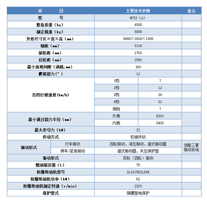 WC5J(A)型防爆柴油機無軌膠輪車是我公司根據中小型煤礦井下的運輸實際要求研制開發的一種新型運載工具,是一款以具有國Ⅲ排放標準、增壓中冷、電控高壓共軌噴射型式的ZL4105DZLDFB防爆柴油機為動力,輸出功率62kW、機械傳動、濕式制動、后輪(四輪)驅動的煤礦井下無軌式運輸機械。 失壓保護型濕式制動系統的應用,使工作更加可靠,因系統故障和制動管路發生任何故障而失壓時,制動器均能自動實現制動,確保車輛的安全,失壓保護型濕式制動器可以集行車制動、駐車制動和緊急制動于一身,精簡了結構,給車輛總體布局帶來方便。使車輛制動更加安全可靠。 該車動力強勁,性能穩定,加裝了先進的進排氣系統及自動保護裝置,具有可靠優越的防爆性能。具有井下作業所需的強勁動力和可信賴的安全保障措施。 車架全部采用載重汽車專用優質碳素結構鋼510L軋制型鋼為原材料,進一步保證了整車的強度。提高了整車的使用壽命。