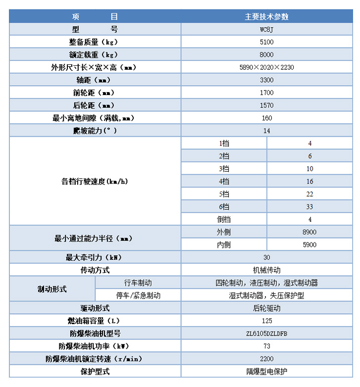 WC8J型防爆柴油機無軌膠輪車是根據中小型煤礦井下的運輸實際研制開發的一種新型運載工具,是一款以大功率、具有國Ⅲ排放標準、增壓中冷、電控高壓共軌噴射型式的ZL6105DZLDFB防爆柴油機(輸出功率為73kW(防爆后))為動力、機械傳動、濕式制動、后輪驅動的煤礦井下無軌式運輸機械。 失壓保護型濕式制動系統的應用,使工作更加可靠,因系統故障和制動管路發生任何故障而失壓時,制動器均能自動實現制動,確保車輛的安全,失壓保護型濕式制動器可以集行車制動、駐車制動和緊急制動于一身,精簡了結構,給車輛總體布局帶來方便。使車輛制動更加安全可靠。 該車動力強勁,性能穩定,加裝了先進的進排氣系統及自動保護裝置,具有可靠優越的防爆性能。具有井下作業所需的強勁動力和可信賴的安全保障措施。 車架采用載重汽車專用優質碳素結構鋼510L軋制型鋼為原材料的鉚接車架,前后鋼板座用材為ZG350-470鑄造機座,進一步保證了機架終生不出現疲勞損壞。 主要原材料和零部件采用國內知名企業生產,質量保證。