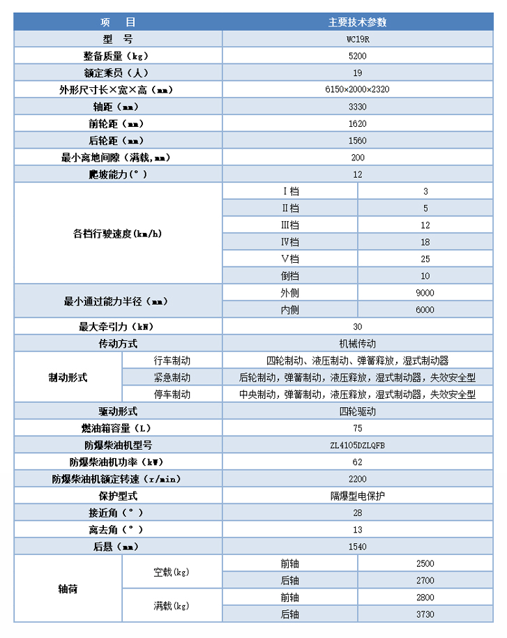 WC19R型防爆柴油機無軌膠輪車是我公司根據中小型煤礦井下的運輸實際要求研制開發的新型運載工具,是以具有國Ⅲ排放標準、增壓中冷、電控高壓共軌噴射型式的ZL4105DZLQFB氣起動防爆柴油機為動力、輸出功率分別為62kW、機械傳動、濕式制動、四輪驅動的煤礦井下無軌式運輸機械。相比較電起動具有如下特點: 1、能無級調速?刂茐嚎s空氣流量、壓力,即可調節氣動起動機的功率和轉速。 2、安全可靠。避免了電起動時的冒火現象。 3、過載能力大,具有較高的起動轉矩。 4、操作維修簡單、對惡劣氣候環境適應性好,不怕雨淋受潮。 濕式制動系統升級為工作制動、緊急制動、停車制動三套各自獨立的機構。工作制動為濕式制動器,緊急制動和停車制動為安全失效型,當壓力消失時,系統處于制動狀態。使車輛更加安全可靠。為煤礦井下安全生產提供可靠保證。 車架采用載重汽車專用優質碳素結構鋼510L軋制型鋼為原材料的鉚接車架,前后鋼板座用材為ZG350-470鑄造機座,進一步保證了機架終生不出現疲勞損壞。 主要原材料和零部件采用國內知名企業生產,質量保證。